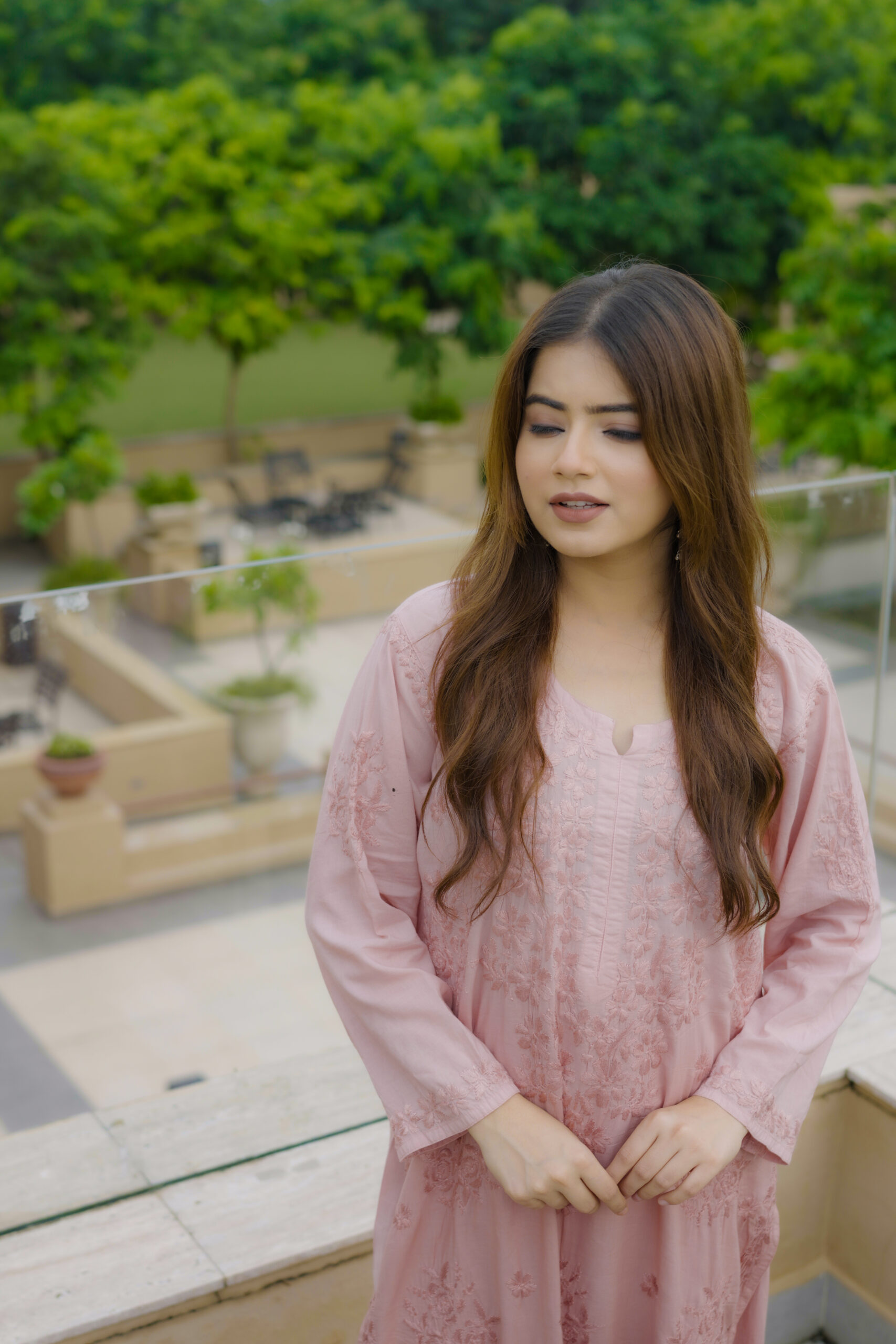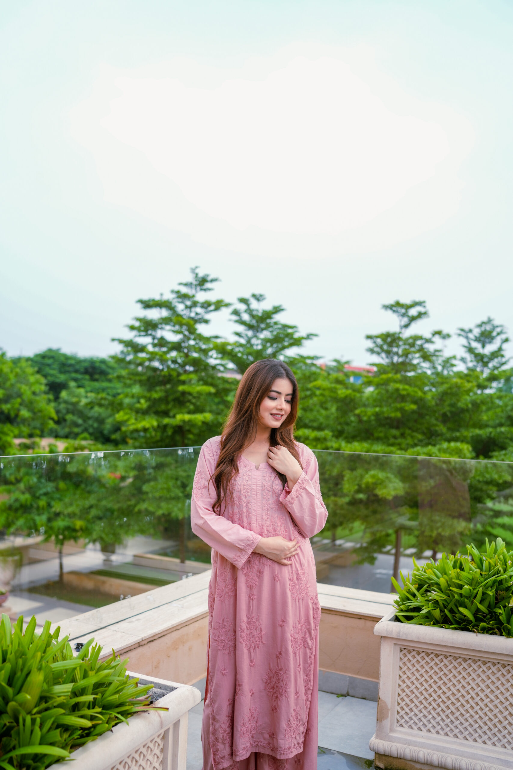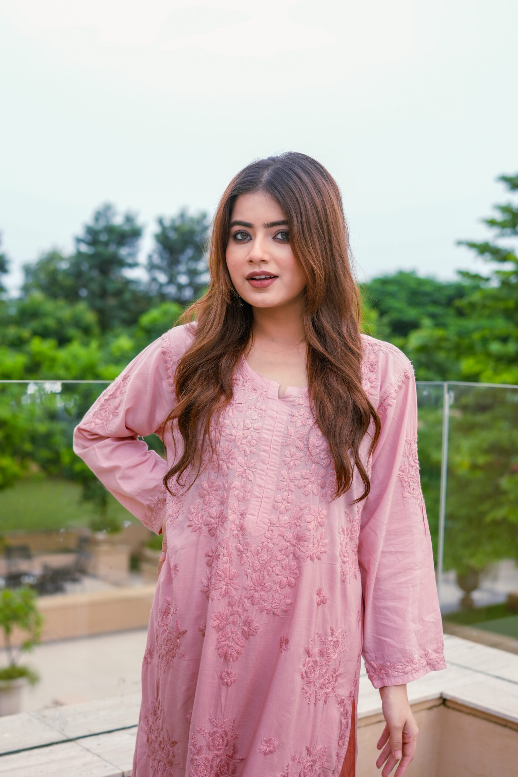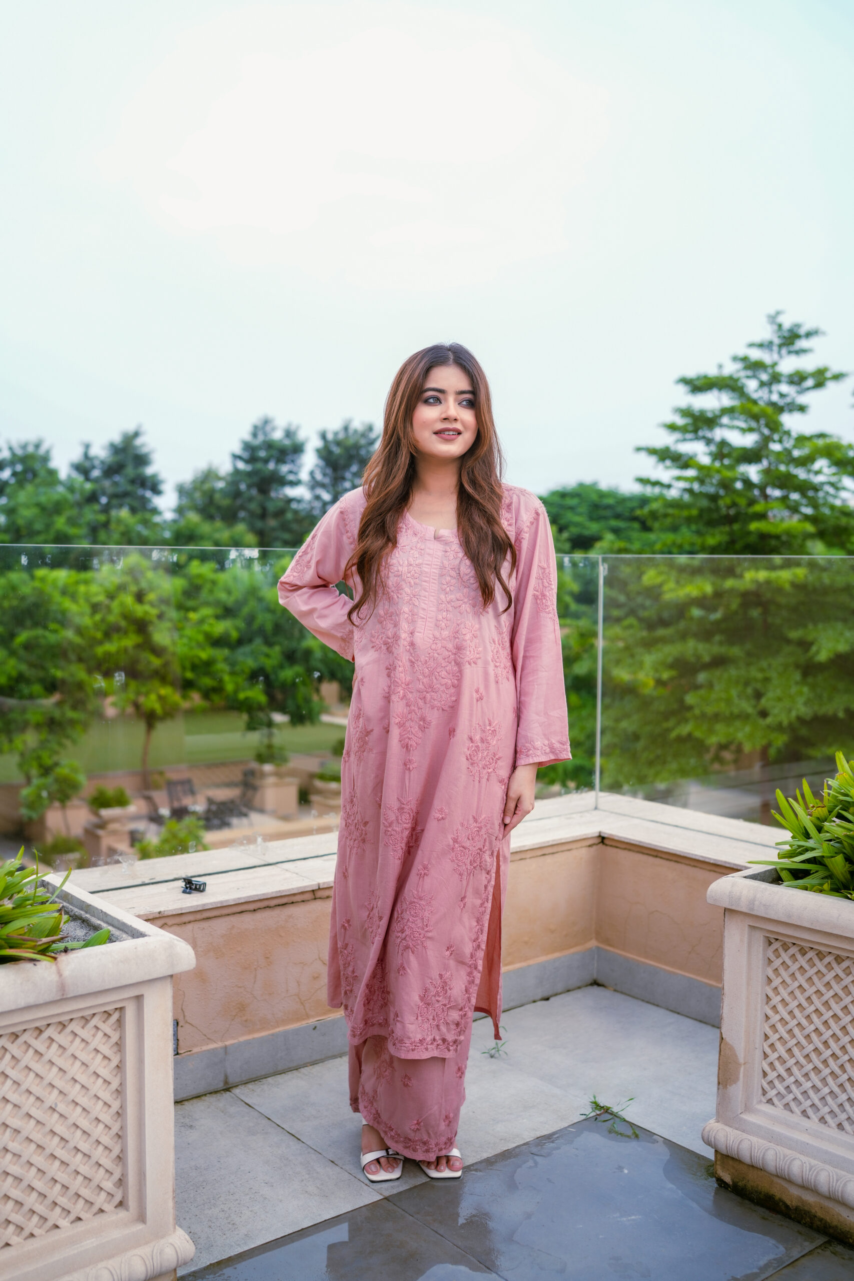 The kurta features detailed tone-on-tone embroidery that adds depth and sophistication without overpowering the silhouette. The soft pink shade enhances its feminine appeal, creating a timeless look that suits a wide range of age groups. Paired with coordinated bottoms, the set offers a balanced mix of modern and traditional design.