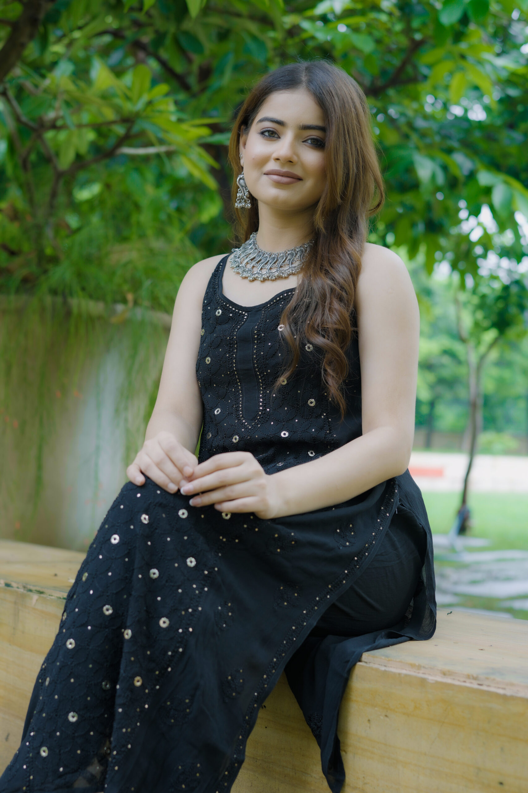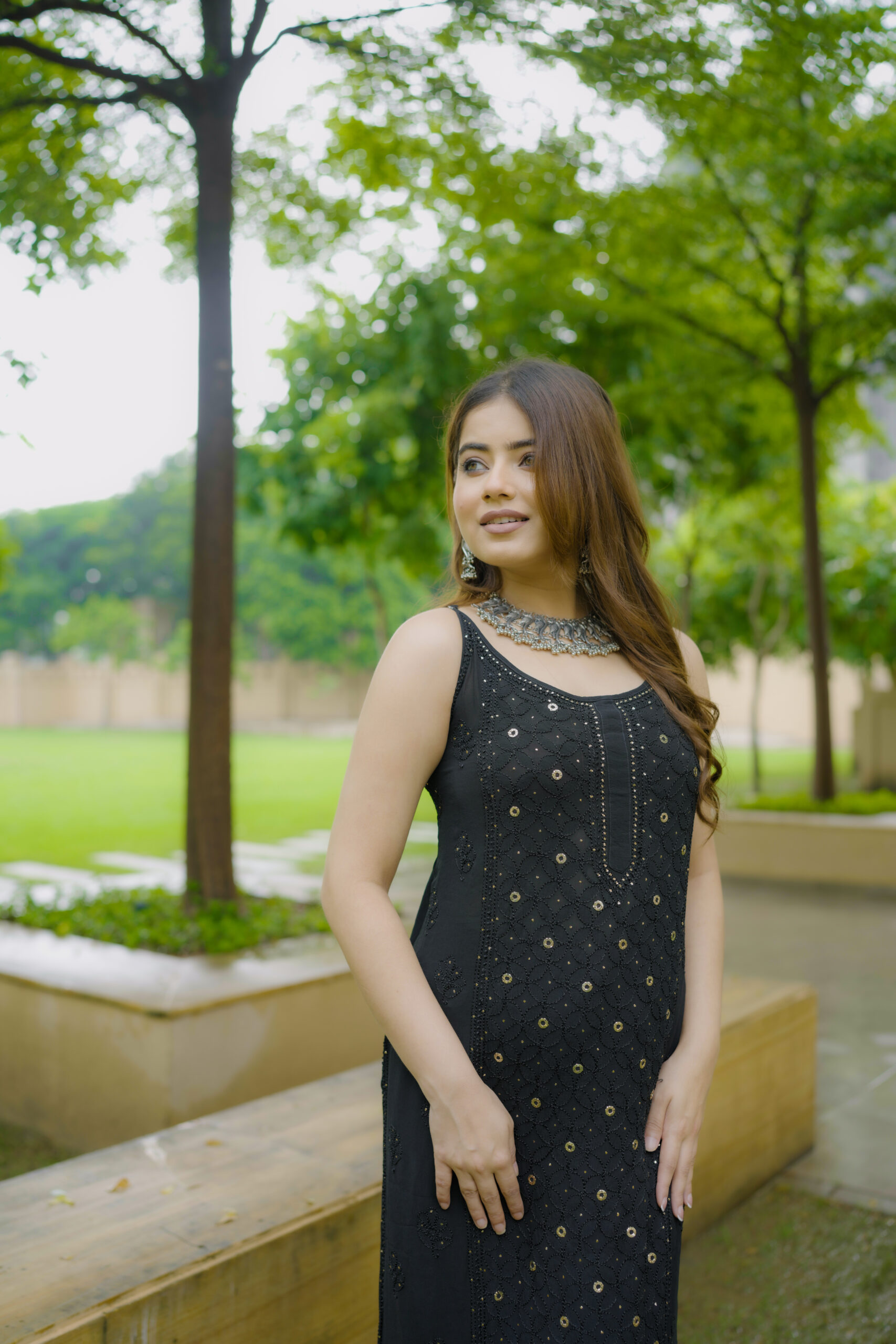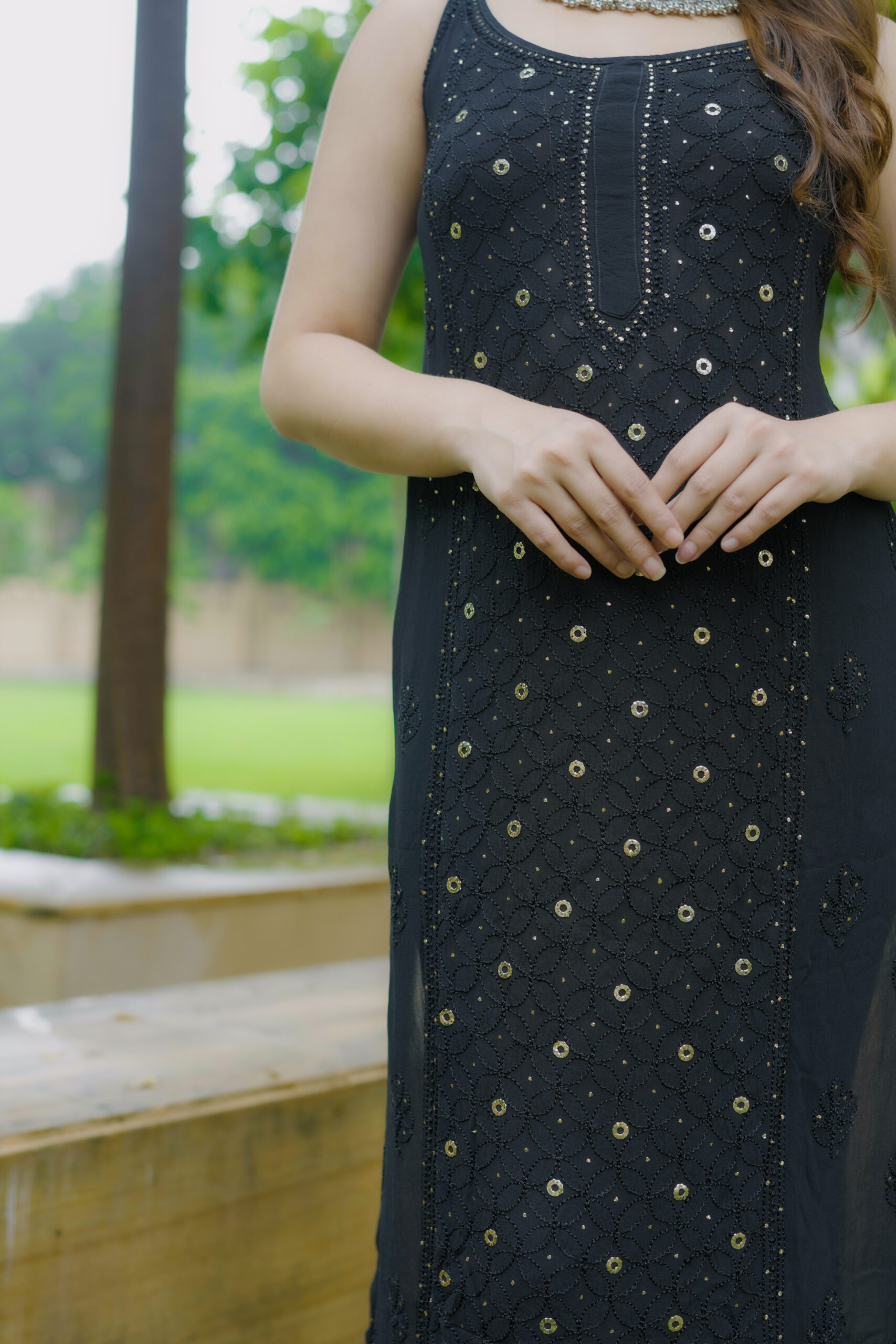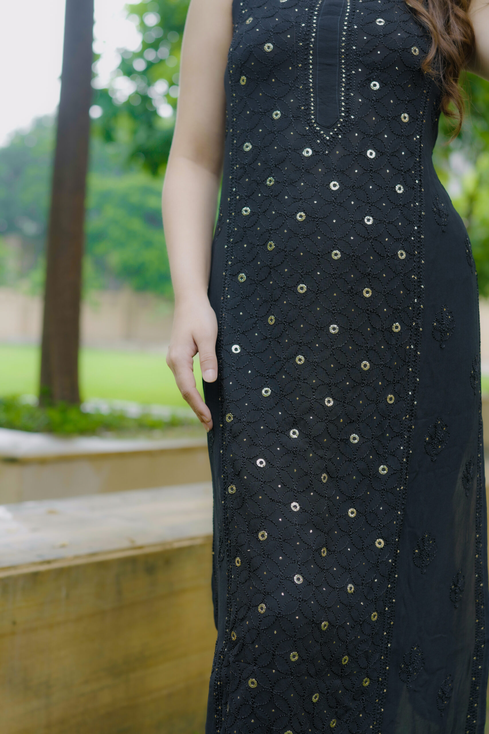 Available in One classic colour—Black, each shade complements the fabric’s natural sheen and highlights the delicate craftsmanship of the outfit.