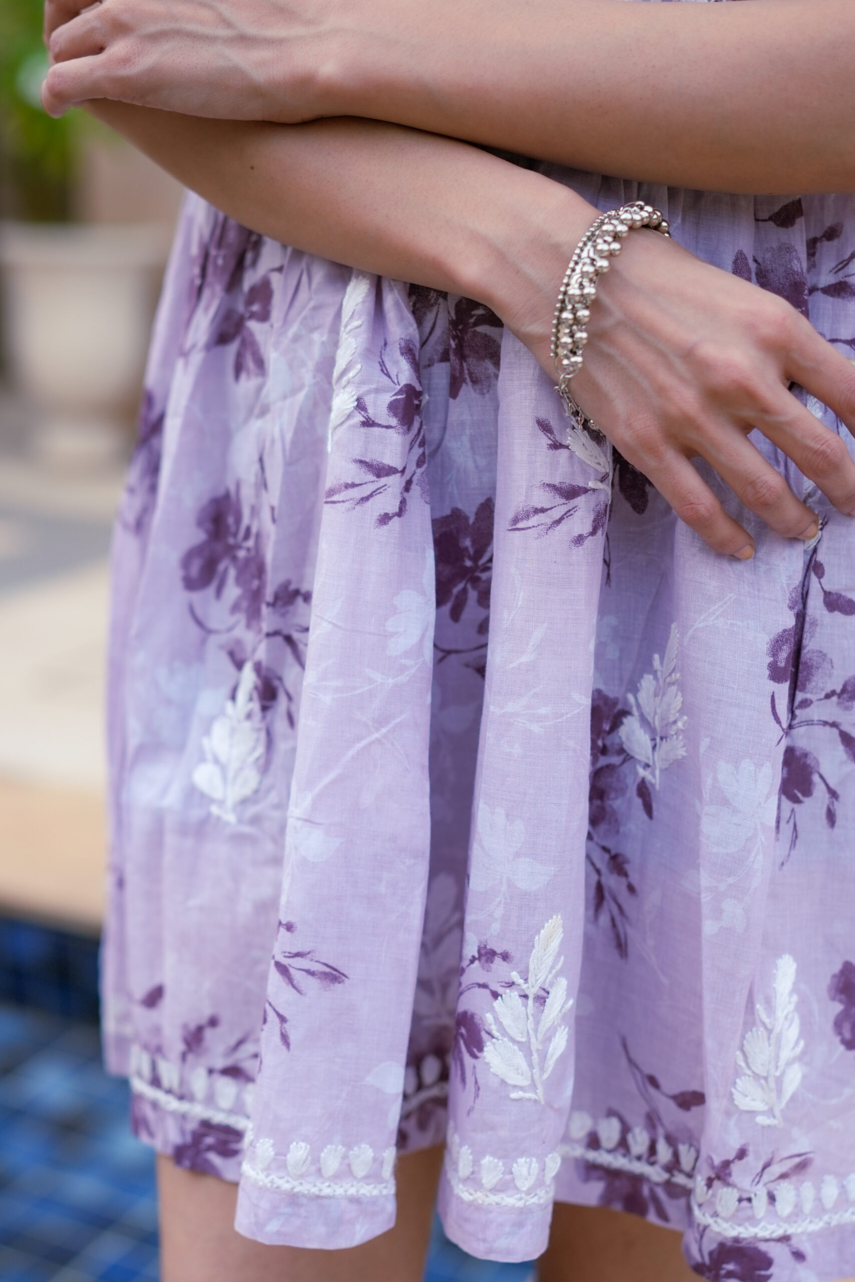 Design: Embroidered yoke with floral pattern; flared silhouette